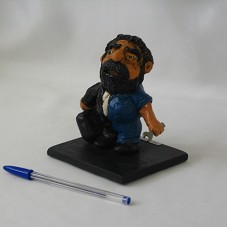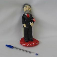 BONECO (16 CM) DO LULA, CONFECCIONADO EM BISCUIT, VESTINDO TERNO PRETO, SEGURANDO UM PAPEL ENROLADO NA MÃO ESQUERDA, E COM O CORAÇÃO SALTANDO DO PEITO, POR UMA MOLA, COM O NÚMERO '13' INSCRITO NELE. FIXADO EM BASE VERMELHA, DE MESMO MATERIAL, ONDE HÁ A INSCRIÇÃO 'LULA / AMOR PELO BRASIL / ROSAN LUIZ / 9838-1826 / MAUÁ / 14.09.02'.