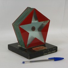 ESCULTURA (15,5X4X15 CM) FORMADA COM FOLHAS DE VIDRO, FORMATO PENTAGONAL, TENDO AS LATERAIS EXTERNAS COM PINTURA EM NEGATIVO, NA COR VERMELHA, FORMANDO UMA ESTRELA, COM UM BÓTON, NO CENTRO, COM A INSCRIÇÃO 'PT'. COLADA EM BASE DE MÁRMORE (14X14X2 CM), COM ASSINATURA DO ARTISTA E A INSCRIÇÃO 'DESIGN NELSON LEIRNER'.