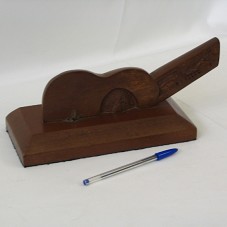 ARTESANATO EM MADEIRA, MOSTRANDO A METADE DE UM VIOLÃO (23X3X7 CM), ONDE HÁ NO CABO, CASAS E IGREJA ESCULPIDAS. NA PARTE INFERIOR DO VIOLÃO, TRÊS CRISTAIS DE ROCHA FIXADOS, SENDO QUE UM CHEGOU QUEBRADO. FIXADO EM BASE TRAPEZOIDAL (25X12X4,5 CM), EM MADEIRA, ONDE HÁ A INSCRIÇÃO 'À LULA, COM CARINHO / PAVÃO-MG'.
