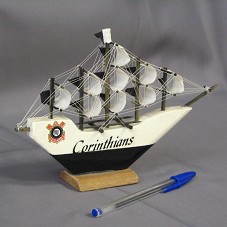 MINIATURA DE UMA CARAVELA (22X3,5X14 CM), EM MADEIRA. CASCO PINTADO NAS CORES BRANCO E PRETO, COM A INSCRIÇÃO 'CORINTHIANS' E ADESIVO COM EMBLEMA DO TIME. COLADA EM BASE DE MADEIRA. NO FUNDO DA BASE, MANUSCRITO, 'FAÇA CADA DIA VALER A PENA'.