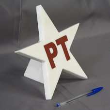 ESCULTURA (24X2X25 CM) EM MÁRMORE BRANCO, NO FORMATO DE UMA ESTRELA, COM A INSCRIÇÃO 'PT', EM VERMELHO, NO CENTRO FRONTAL. POSSUI APOIO (QUE ENCONTRA-SE DESCOLADO) EM MESMO MATERIAL.