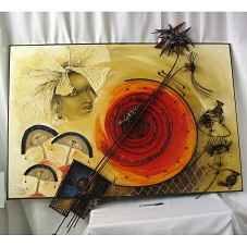 PINTURA SOBRE TELA (100X150 CM), COM FUNDO EM TONS DE AMARELO E MARROM, RETRATANDO O ROSTO DE UMA MULHER NEGRA, NO CANTO SUPERIOR ESQUERDO. NO CENTRO, PINTURA CONCÊNTRICA, EM TONS DE VERMELHO; E, NA LATERAIS, DESENHOS ESTILIZADOS DE FIGURAS FEMININAS. MOLDURA EM VERGALHÃO DE FERRO, COM COMPOSIÇÃO PRESA A ESTA, E, SOLTA DA TELA, EM MESMO MATERIAL, RETRATANDO A UNIÃO DE UM HOMEM E UMA MULHER (AO CENTRO), E DE MULHERES CARREGANDO VASOS NAS LATERAIS. NO CANTO INFERIOR ESQUERDO, ASSINATURA DO ARTISTA, 'IS NLRIKULU 2004'.