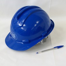 CAPACETE DE OBRA, NA COR AZUL, TENDO NA PARTE FRONTAL, EM BRANCO, LOGOMARCA COM A INSCRIÇÃO 'CBA'.