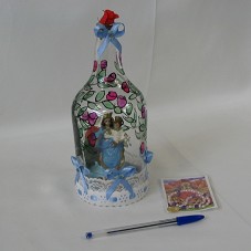 IMAGEM DE NOSSA SENHORA DE MONTE SERRAT SEGURANDO UMA CRIANÇA, ACONDICIONADA DENTRO DE UMA GARRAFA, QUE RECEBE PINTURA COM MOTIVOS FLORAIS E TEM BASE REVESTIDA DE RENDA BRANCA COM DETALHES EM FITA DE CETIM AZUL. ACOMPANHA SANTINHO DE PAPEL, COM ORAÇÃO À MONT SERRAT; E CORDÃO DE MIÇANGAS ROSAS COM MEDALHINHA DOURADA.