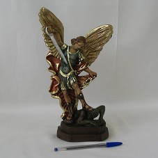 IMAGEM (30 CM) DE SÃO MIGUEL, EM GESSO, EM CIMA DE UM 'DEMÔNIO', EMPUNHANDO UMA ESPADA PARA ESTE. NA BASE, A INSCRIÇÃO 'SÃO MIGUEL'; E, ATRÁS, 'ROSA IÓRIO / 13.04.2006 / SOROCABA'.