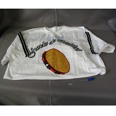 CAMISETA (TAM G) EM MALHA BRANCA, DE MANGA CURTA, COM DETALHES DE LISTRAS PRETAS NAS MANGAS. NA FRENTE, ESTAMPA COM DESENHO DE UM PANDEIRO E A INSCRIÇÃO 'FUNDO DE QUINTAL'. POSSUI, AINDA, ASSINATURAS MANUSCRITAS DE DIVERSAS PESSOAS. ATRÁS, 'CACIQUE DE RAMOS / LEMBRANÇA DO BIRA PRESIDENTE / CACIQUE DE RAMOS É CULTURA / SEJA MAIS UM DOS NOSSOS'.