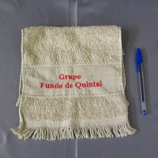 TOALHA DE MÃO, NA COR BEGE, COM BARRA PARA BORDADO, ONDE HÁ A INSCRIÇÃO 'GRUPO FUNDO DE QUINTAL', BORDADO EM VERMELHO.