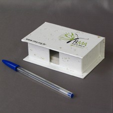 PORTA-PAPEL DE RECADOS (11,X7,5X4 CM) EM PAPELÃO, FORRADO COM PAPEL ARTESANAL DE FUNDO BRANCO. NA TAMPA, ESTAMPA EM VERDE E PRETO, COM DESENHO DE UMA BORBOLETA E A INSCRIÇÃO 'RMA REDE DE ONGS DA MATA ATLÂNTICA' E, EM PRETO, 'WWW.RMA.ORG.BR'. POSSUI PAPEL PARA RECADO, ACONDICIONADOS NA PARTE INTERNA. NO FUNDO, ETIQUETA COM A INSCRIÇÃO 'PAPEL CONFECCIONADO COM FIBRAS DE MARCELA / PAPEL ORIGINAL COD. 302'.