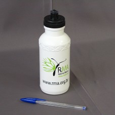 GARRAFA DE ÁGUA (20 CM), TIPO SQUEEZE, NA COR BRANCA, COM TAMPA PRETA. POSSUI ESTAMPA EM VERDE E PRETO, COM DESENHO DE UMA BORBOLETA E A INSCRIÇÃO 'RMA REDE DE ONGS DA MATA ATLÂNTICA'. ATRÁS, EM PRETO, 'WWW.RMA.ORG.BR'.