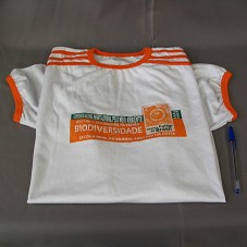 CAMISETA EM MALHA BRANCA, DE MANGA CURTA, COM DETALHES LARANJAS NA GOLA E NOS OMBROS. NA FRENTE, ESTAMPA EM LARANJA E VERDE, COM A INSCRIÇÃO 'II CONFERENCIA NACIONAL INFANTO-JUVENIL PELO MEIO AMBIENTE 2006 / VIVENDO A DIVERSIDADE NA ESCOLA / BIODIVERSIDADE / VAMOS CUIDAR DO BRASIL / ESCOLA MUN. RAIMUNDO ARCANJO DA COSTA'. ATRÁS, 'APOIO / PREF. MUN. DE OEIRAS DO PARÁ / ADM. DULCÍDIO PINHEIRO'.