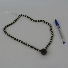 COLAR CONFECCIONADO COM SEMENTES MARRONS INTERCALADAS COM BRANCAS, TENDO COMO PINGENTE UMA SEMENTE MAIOR.