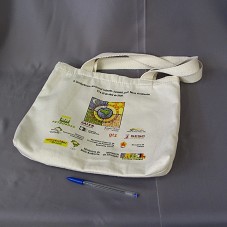 BOLSA/SACOLA EM ALGODÃO CRU, COM ALÇAS EM MESMO MATERIAL, FORRADA EM TNT BEGE. NA FRENTE, ESTAMPA COLORIDA, COM A INSCRIÇÃO 'II CONFERÊNCIA NACIONAL INFANTO-JUVENIL PELO MEIO AMBIENTE / 23 A 28 DE ABRIL DE 2006'. ABAIXO, NOMES E LOGOMARCAS DAS INSTITUIÇÕES DE APOIO, PARCERIA E REALIZAÇÃO, ENTRE ELAS, 'MINISTÉRIO DO MEIO AMBIENTE', 'MINISTÉRIO DA EDUCAÇÃO', E LOGOMARCA DO GOVERNO FEDERAL.