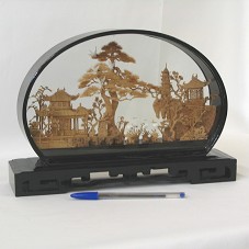 ESCULTURA (28X5X15 CM) EM CORTIÇA E MADEIRA, MOSTRANDO UM CENÁRIO, COMPOSTO POR CASAS/BANGALÔS CHINESES, ÁRVORES E GAIVOTAS. ACONDICIONADA EM REDOMA (29X6X22 CM) COM TAMPO DE VIDRO E MOLDURA EM MADEIRA LAQUEADA DE PRETO, COM BASE EM MESMO MATERIAL. ACONDICIONADA EM ESTOJO FORRADO DE TECIDO ESVERDEADO.