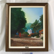 PINTURA (60X50 CM) SOBRE TELA RETRATANDO UMA RUA DE UM VILAREJO, TENDO EM PRIMEIRO PLANO, UM CASAL CONVERSANDO; E, AO FUNDO, AS TORRES E O CAMPANÁRIO DE UMA IGREJA. POSSUI VEGETAÇÃO DENSA, AO FUNDO. NO CANTO INFERIOR DIREITO, ASSINATURA DO ARTISTA. MOLDURA (76X66 CM) EM MADEIRA ESCURA, COM PASSE PARTOUT BEGE COM TEXTURA DE CRAQUELÊ. COLADO NA PARTE INFERIOR DO PASSE-PARTOUT, PLACA METÃLICA COM A INSCRIÇÃO 'EL CORPUS / AUTOR CESAR ORDONEZ / TEGUCIGALPA, M.D.C. HONDURAS C.A'. ATRÁS, PLACA COM A INSCRIÇÃO 'JOSE MANUEL ZELAYA ROSALES / PRESIDENTE CONSTITUICIONAL DE LA REPUBLICA DE HONDURAS / TOMA DE POSECIÓN 27 DE ENERO 2006 / TEGUCIGALPA, M.D.C HONDURAS C.A.'.