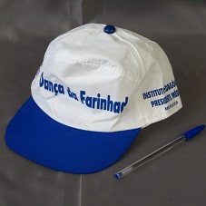 BONÉ EM TECIDO BRANCO, COM ABA AZUL MARINHO. NA FRENTE, ESTAMPA EM AZUL, 'DANÇA DA FARINHA'. NAS LATERAIS, 'INSTITUTO PEDAGÓGICO PRESIDENTE MÉDICI / MERUOCA', E 'TRANSCRATEÚS'.