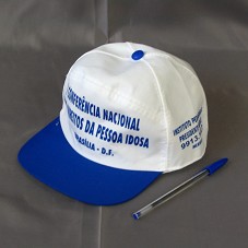 BONÉ EM TECIDO BRANCO, COM ABA AZUL MARINHO. NA FRENTE, ESTAMPA EM AZUL, 'I CONFERÊNCIA NACIONAL DOS DIREITOS DA PESSOA IDOSA / BRASÍLIA-DF'. NAS LATERAIS, 'INSTITUTO PEDAGÓGICO PRESIDENTE MÉDICI / MERUOCA', E 'TRANSCRATEÚS'.