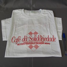 CAMISETA (TAM M) EM MALHA BRANCA, DE MANGA CURTA, NA FRENTE, EM VERMELHO, 'CAFÉ DA SOLIDARIEDADE / INSTITUTO PEDAGÓGICO PRESIDENTE MÉDICE'. ATRÁS, 'EU PARTICIPO'.