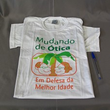 CAMISETA (TAM GG) EM MALHA BRANCA, DE MANGA CURTA. NA FRENTE, EM VERDE, LARANJA E MARROM, 'MUDANDO DE ÓTICA / EM DEFESA DA MELHOR IDADE' E ESTAMPA COM DESENHO DE UM CASAL DE IDOSOS SOB UMA PALMEIRA'. ATRÁS, 'DESVALORIZAR, HUMILHAR E MENOSPREZAR O IDOSO COMO PESSOA, PROFISSIONAL E CIDADÃO: É DISCRIMINAÇÃO / É CRIME / FUNDAI / FUNDO MUNICIPAL DE ASSISTÊNCIA AO IDOSO / SECRETARIA DE PROMOÇÃO SOCIAL / PREFEITURA DE MACAÉ / COMIM / CONSELHO MUNICIPAL DO IDOSO DE MACAÉ'.