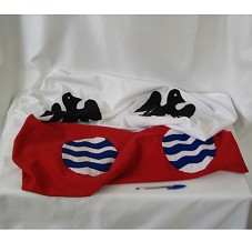 BANDEIRA (168X120,5 CM), COM A PARTE SUPERIOR BRANCA, COM DESENHO DE TRÊS AVES PRETAS; E, PARTE INFERIOR VERMELHA, COM TRÊS CÍRCULOS BRANCOS COM LISTRAS AZUIS NA PARTE INTERNA. POSSUI ILHÓS EM UMA DAS LATERAIS.