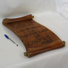 TALHA EM MADEIRA (47X26 CM), ENTALHADA COMO UM PERGAMINHO, COM A INSCRIÇÃO 'COM AJUDA DE DEUS TUDO E POSSIVEL / LEMBRANÇA DA TERCEIRA IDADE DE ULIANÓPOLIS - PARÁ'. POSSUI DETALHES PINTADOS EM DOURADO.