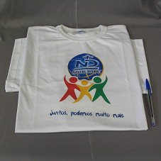 CAMISETA EM MALHA BRANCA, DE MANGA CURTA. NA FRENTE, ESTAMPA COM UM CÍRCULO AZUL, COM DESENHOS DO MAPA MUNDI E LOGOMARCA DA'NOTRE DAME' INSCRITOS; ABAIXO, FIGURAS HUMANAS ESTILIZADAS, NAS CORES VERDE, AMARELO E VERMELHO, E A INSCRIÇÃO 'JUNTOS, PODEMOS MUITO MAIS'.