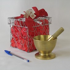 PILÃO (8,5X8,5X7 CM) EM METAL ACOBREADO, COM BASE CIRCULAR E BOCA EM MESMO FORMATO. NO CORPO EXTERNO, A GRAVAÇÃO 'AO ILMO CASAL LULA E MARIZA / UM GRANDE ABRAÇO DA FAMILIA LINARD / MISSÃO VELHA / 06.06.06'. ACOMPANHA SOQUETE, EM MESMO MATERIAL. ACONDICIONADO EM CAIXA ARAMADA, REVESTIDA INTERNAMENTE COM PAPEL DE SEDA VERMELHO.