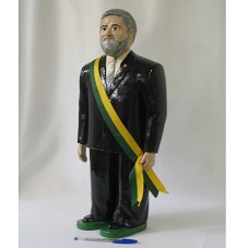 ESCULTURA (54 CM) EM ARGILA, REPRESENTANDO O PRESIDENTE LULA, DE TERNO PRETO, VESTINDO A FAIXA PRESIDENCIAL. NA BASE DO PÉ ESQUERDO, A INSCRIÇÃO 'CORRINHA SPP / MISSAO VELHA - CE'. NA DIREITA, 'FONE: 088 - 5420004'.