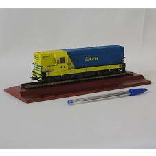 MINIATURA DE LOCOMOTIVA (17X4X6 CM), NAS CORES AZUL E AMARELA, EM CIMA DE TRILHO FERROVIÁRIO, E FIXADA EM BASE DE MADEIRA ENVERNIZADA. NAS LATERAIS, A INSCRIÇÃO 'COMPANHIA FERROVIÁRIA DO NORDESTE' E LOGOMARCA. POSSUI O NÚMERO '4203'. ACONDICIONADA EM CAIXA DE PAPELÃO DOURADO, COM NOME DO FABRICANTE NELA.