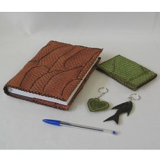 AGENDA PERMANENTE (14,5X20,5 CM) COM SOBRECAPA EM COURO DE PEIXE (PELE DE TILÁPIA), NA COR MARROM. ACOMPANHA CARTEIRA DE DOCUMENTOS, EM MESMO MATERIAL, NA COR VERDE; E DOIS CHAVEIROS, UM EM FORMATO DE PEIXE, E OUTRO EM CORAÇÃO. ACOMPANHA TRÊS CARTÕES EM NOME DE 'ART PELE', 'JAGUAR PEIXE' E 'JAGUART PEIXE'.