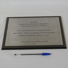 PLACA (25X21 CM) EM AÇO ESCOVADO, COM A INSCRIÇÃO, EM PRETO, 'AO ILMO. SENHOR PRESIDENTE DA REPÚBLICA LUIZ INÁCIO LULA DA SILVA / EM AGRADECIMENTO A REGULARIZAÇÃO DOS 5.365 MATA-MOSQUITOS/FUNASA/RJ / SINTSAUDE-RJ (FILIADO A CUT). / NOVA IGUAÇU, 14 DE JUNHO DE 2006'. FIXADA EM BASE DE ACRÍLICO FUMÊ (28X23 CM), BISOTADA NAS EXTREMIDADES. ACONDICIONADA EM ESTOJO FORRADO DE LYCRA AZUL MARINHO.