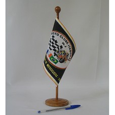 BANDEIRA DE MESA (14X20 CM) FIXADA EM HASTE (33 CM) DE MADEIRA, COM BASE CIRCULAR. POSSUI A INSCRIÇÃO 'MOTO CLUBE ITABORAÍ / RJ / 9º ENCONTRO NACIONAL DE MOTOCICLISTAS / 2005', E ESTAMPA DE UM MOTOCICLISTA CORRENDO NA MOTO.