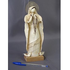 IMAGEM DE UMA SANTA (26 CM), CONFECCIONADA EM PALHA DE MILHO, COM ÁUREA EM FOLHA DESIDRATADA. FIXADA EM BASE DE MADEIRA, ONDE HÁ DOIS PÁSSAROS, EM MESMO MATERIAL, COLADOS AO PÉ DA SANTA. POSSUI CABELO E CORDÃO DO CRUCIFIXO EM LÃ MARROM, E ARMAÇÃO INTERNA EM ARAME.