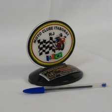 PLACA OVAL (12X8 CM) FIXADA EM BASE (11X7,5X2 CM) DE MESMO FORMATO. POSSUI A INSCRIÇÃO 'MOTO CLUBE ITABORAÍ / RJ' E ESTAMPA DE UM MOTOCICLISTA CORRENDO NA MOTO. NA BASE, A INSCRIÇÃO '10º ENCONTRO NACIONAL DE MOTOCICLISTAS / ITABORAÍ-RJ / 10 ANOS / AMIZADE, FRATERNIDADE E COMPANHEIRISMO / MAIO DE 2006'.