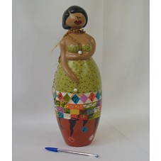 ESCULTURA (38 CM) EM CERÂMICA, REPRESENTANDO UMA MULHER MORENA, COM VESTIDO TOMARA-QUE-CAIA, TENDO NO PESCOÇO, COLAR DE MIÇANGAS ENROLADO. CORPO ABAULADO. EM UMA DAS LATERAIS DA BASE, A INSCRIÇÃO 'KCO'.