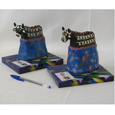 DOIS ARTESANATOS (14X11X6 E 13X11X6,5 CM), REPRESENTANDO DOIS BOIS-BUMBÁS, DE CORPO PRETO COM PINTURA DE BANDEIRAS DE FESTA JUNINA E FLORES, E SAIA AZUL. FIXADOS, CADA UM, SEPARADAMENTE, SOBRE BASE DE MADEIRA, FORRADA COM PAPEL AZUL COM FOTOGRAFIA DE BANDEIROLAS E A INSCRIÇÃO 'GOVERNO DO MARANHÃO / ROMPENDO COM O ATRASO / CULTURA' E 'SÃO JOÃO DO MARANHÃO'.