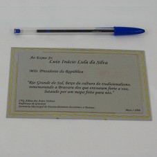 PLACA (10X15 CM) EM METAL PRATEADO, COM BORDADURA DESENHADA EM DOURADO. POSSUI A INSCRIÇÃO 'AO EXMO. SR. LUIZ INÁCIO LULA DA SILVA / MD. PRESIDENTE DA REPÚBLICA / RIO GRANDE DO SUL, BERÇO DA CULTURA DO TRADICIONALISMO, REMEMORANDO A BRAVURA DOS QUE ENTOARAM FORTE A VOZ, LUTANDO POR UM MAPA FEITO PARA NÓS. / CTG ALDEIA DOS ANJOS 50 ANOS / PREFEITURA DE GRAVATAÍ / SECRETARIA MUNICIPAL DE DESENVOLVIMENTO ECONÔMICO E TURISMO / MAIO/2006'. ACONDICIONADA EM ESTOJO METÁLICO.U