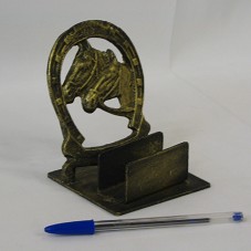 PORTA-CARTÃO (12X9,5X9,5 CM), DE MESA, EM FERRO, COM UMA FERRADURA NA PARTE POSTERIOR E DOIS CAVALOS INSCRITOS NELA. POSSUI PINTURA IRREGULAR, NA COR DOURADA.
