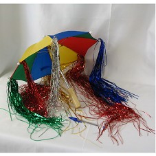 SOMBRINHA DE FREVO, NAS CORES AZUL, VERDE, VERMELHO E AMARELO, COM CABO EM MADEIRA CLARA. POSSUI FITILHOS COLORIDOS EM PAPEL/PLÁSTICO METALIZADO, NAS MESMAS CORES DA SOMBRINHA, FIXADOS NAS EXTREMIDADES.