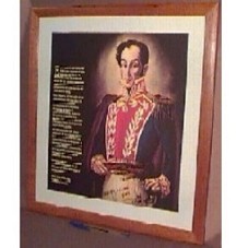 QUADRO (49X44CM) CONTENDO REPRODUÇÃO DA OBRA 'SIMON BOLIVAR', DO ARTISTA PLÁSTICO F. ESPEJO R., A DEDICATÓRIA 'A LULA, CON UN INMENSO COMPROMISO Y SOLIDARIDAD. / RECIFE, 25 ABRIL 2003 / CHÁVEZ' E A INSCRIÇÃO 'ESTE RETRATO ES UNA RÉPLICA DEL BOLÍVAR QUE REPOSA EN EL SALÓN AYACUCHO DEL PALACIO DE MIRAFLORES, EL CUAL FUE ARRANCADO, SACADO DE ESTE RECINTO Y DEPOSITADO 'COMO BASURA' EN UN BAÑO, POR LOS PROTAGONISTAS DEL GOLPE FASCISTA DEL 12 DE ABRIL DE 2002. / ESTOS OLIGARCAS, AL VIEJO ESTILO DE LOS ANTIBOLIVARIANOS DEL SIGLO XIX Y XX, SECUESTRARON AL PRESIDENTE BOLIVARIANA DE VENEZUELA, HUGO CHÁVES FRÍAS, ABOLIERON LOS PODERES, EL NOMBRE DE LA REPÚBLICA BOLIVARIANA DE VENEZUELA Y DESATARON LA MÁS CRUEL REPRESIÓN CONTRA NUESTRO PUEBLO. / EN CONMEMORACIÓN DEL PRIMER ANIVERSARIO DE ESTOS INGRATOS SUCESSOS, HEMOS QUERIDO RECORDAR CON ESTE CUADRO ESTA FECHA, EN DESAGRAVIO AL LIBERTADOR SIMÓN BOLIVAR - GUÍA DE ESTE PROCESSO DE CAMBIO - Y RECONOCERLE A SU VEZ AL PUEBLO Y A LA FUERZA ARMADA NACIONAL LA GLORIOSA JORNADA DE RESTITUCIÓN DEMOCRÁTICA. / SE EXPONE ESTA OBRA COMO TESTIMONIO DE NUESTRO COMPROMISO CON EL SOBERANO, EL IDEARIO BOLIVARIANO Y NUESTRA CONSTITUCIÓN. / CARACAS 13 DE ABRIL DE 2003. / PRESIDENCIA DE LA REPÚBLICA BOLIVARIANA DE VENEZUELA.'. MOLDURA EM MADEIRA COM PASSE-PARTOUT BRANCO.