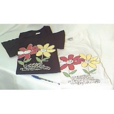 DUAS CAMISETAS (TAM G), EM MALHA DE ALGODÃO, UMA BRANCA E A OUTRA PRETA, COM SERIGRAFIA DE DUAS MARGARIDAS, UMA VERMELHA E A OUTRA AMARELA, ASSINADA POR ZIRALDO, COM A INSCRIÇÃO 'COORDENAÇÃO DE TRANSPLANTE DE ÓRGÃOS DO HOSPITAL UNIVERSITÁRIO - UFRJ'.