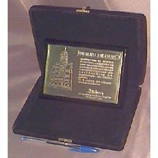 PLACA (12X17CM) EM METAL DOURADO TRAZENDO GRAVADOS A FACHADA DE UMA IGREJA E A INSCRIÇÃO 'JUBILEU DE OURO / HOMENAGEM DA IGREJA EVANGÉLICA ASSEMBLÉIA DE DEUS EM MADUREIRA, RIO DE JANEIRO, RJ, POR OCASIÃO DO CINQÜENTENÁRIO DO ANIVERSÁRIO DE INAUGURAÇÃO DO TEMPLO MATRIZ. / 'E A GLÓRIA DO SENHOR ENCHEU O TEMPLO' / PR. DR. ABNER DE CÁSSIO FERREIRA / PASTOR PRESIDENTE'. BASE EM ACRÍLICO PRETO. ACONDICIONADA EM ESTOJO PRETO.