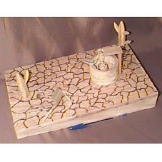 MAQUETE (14X21X36CM) EM MADEIRA RETRATANDO UMA CISTERNA COM BALDE, DOIS CACTOS E UM ESQUELETO DE VACA SOBRE O SOLO RACHADO PELA SECA. O VERSO TRAZ GRAVADA A ASSINATURA DO AUTOR E A INSCRIÇÃO 'SE HOUVESSE DECÊNCIA E HONESTIDADE, DE MUITOS, COM CERTEZA A SOLUÇÃO SERIA MAIS FÁCIL. / ENQUANTO ISSO, FICA A DÚVIDA... / FOME ZERO?'