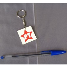 CHAVEIRO (4X4 CM) EM PLÁSTICO BRANCO, DE FORMATO QUADRADO. DE UM LADO, A ESTRELA DO PT E DO OUTRO LADO A INSCRIÇÃO EM VERMELHO 'VOTE PT 82 / PARTIDO DOS TRABALHADORES'.