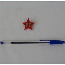 BÓTON EM PLÁSTICO VERMELHO (3 CM), NO FORMATO DA ESTRELA DO PT E A INSCRIÇÃO 'PT' EM DOURADO.