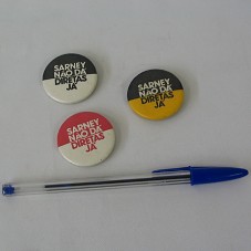 TRÊS BÓTONS CIRCULARES (4 CM), EM METAL PRATEADO, COM FUNDO PRETO E BRANCO, PRETO E AMARELO, VERMELHO E BRANCO . POSSUI A INSCRIÇÃO 'SARNEY NÃO DÁ / DIRETAS JÁ'.