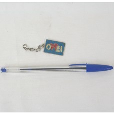 CHAVEIRO (3X2 CM) EM METAL PRATEADO, DE FORMATO RETANGULAR, COM O FUNDO AZUL. POSSUI A INSCRIÇÃO 'OPTEI' EM VERMELHO E BRANCO.