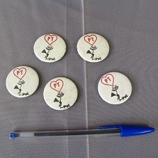TRINTA E DOIS BÓTONS CIRCULARES (4 CM), EM METAL PRATEADO, COM FUNDO BRANCO. POSSUI O DESENHO DA GRAÚNA DO CARTUNISTA HENFIL E A INSCRIÇÃO 'PT' DENTRO DE UM CORAÇÃO.