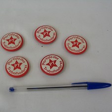 VINTE BÓTONS CIRCULARES (4 CM), EM METAL PRATEADO, COM FUNDO BRANCO E BORDAS VERMELHAS. POSSUI A INSCRIÇÃO 'PARTIDO DOS TRABALHADORES' E A ESTRELA DO PT.