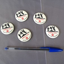 TRINTA E DOIS BÓTONS CIRCULARES (4 CM), EM METAL PRATEADO, COM FUNDO BRANCO. POSSUI O DESENHO REPRESENTANDO UMA RODA DE CAPOEIRA E A INSCRIÇÃO 'VAMOS À LUTA / PARTIDO DOS TRABALHADORES'.