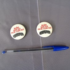 TRÊS BÓTONS CIRCULARES (4 CM), EM METAL PRATEADO, COM FUNDO BRANCO. POSSUI A INSCRIÇÃO 'RUIM SEM ELE / PIOR COM ELE' E O DESENHO DE UM BIGODE.